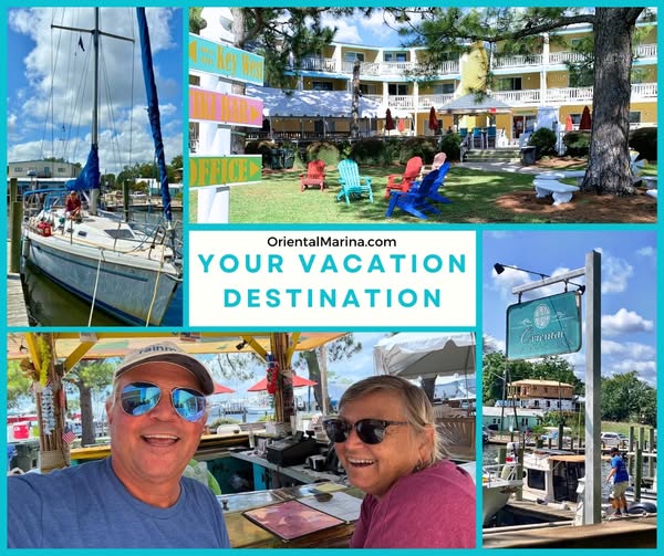 Catmandu cruised through the quiet and lovely Waccamaw River, reminding me of Kipling’s “great gray-green greasy Limpopo River, all set about with fever trees.1” We didn’t love Morehead City Yacht Basin, but it was quiet compared to Mile Hammock anchorage, where giant military Osprey helicopters took off and landed in a deafening roar every ten minutes until midnight, looking like giant angry grasshoppers. The next day the calm of Adams Creek made up for it. We stopped at Oriental Inn and Marina, and made an appearance on their Facebook page.